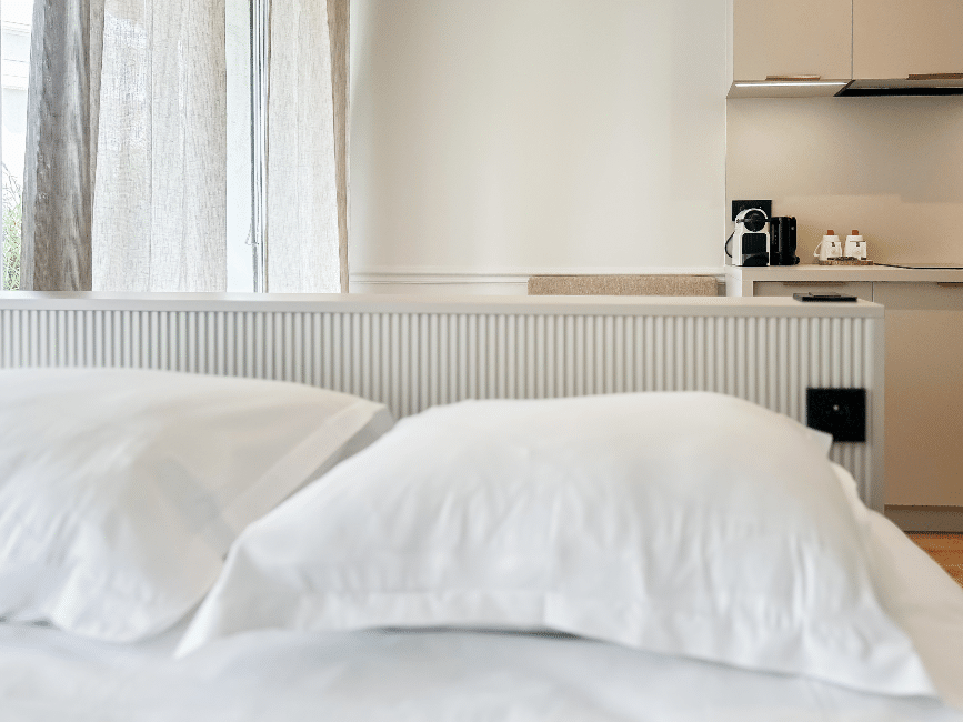 Une tête de lit permet de séparer l’espace cuisine de l’espace nuit.