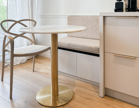 Afin d’optimiser l’espace, une banquette à deux tiroirs complète l’espace repas.