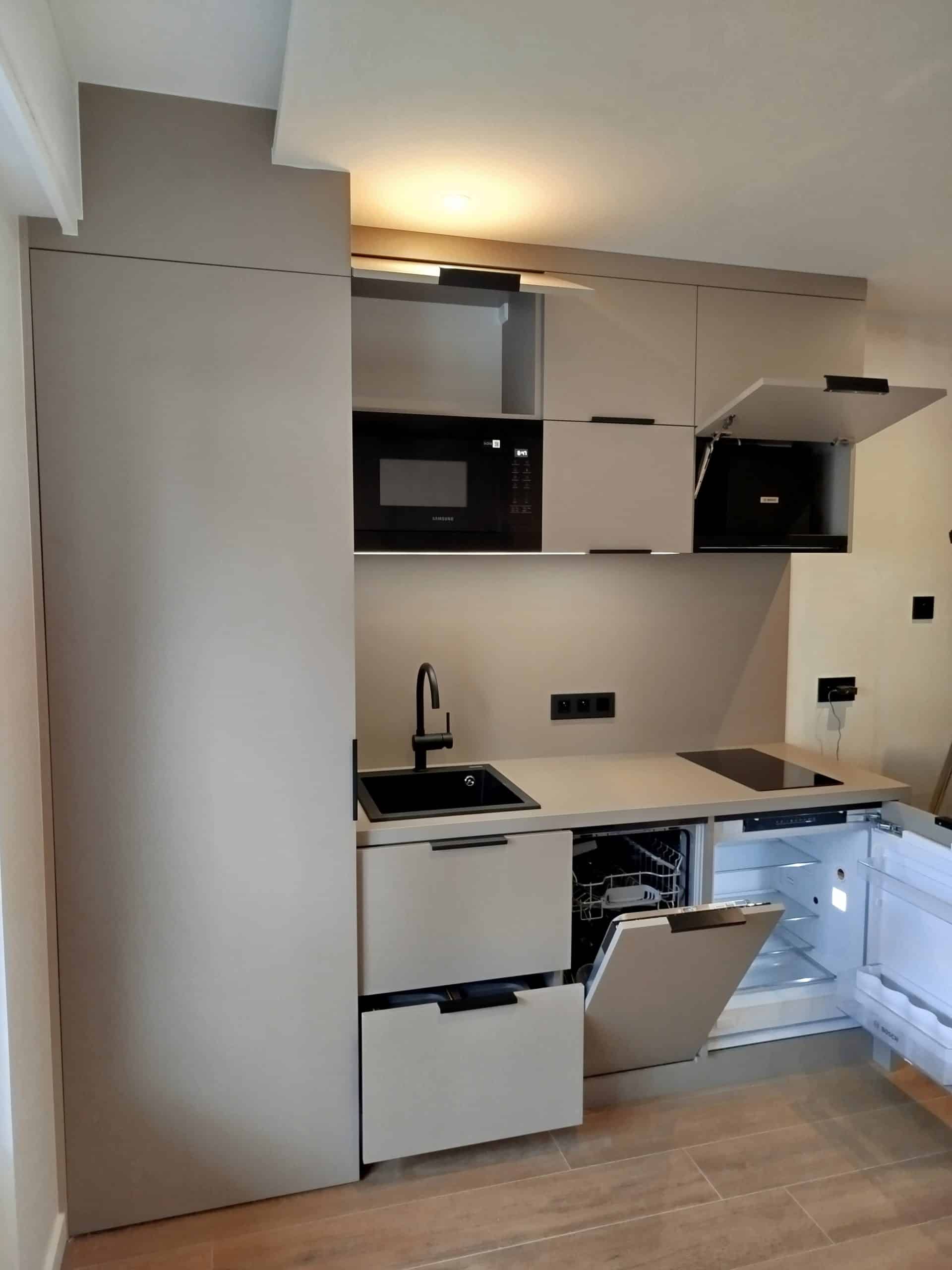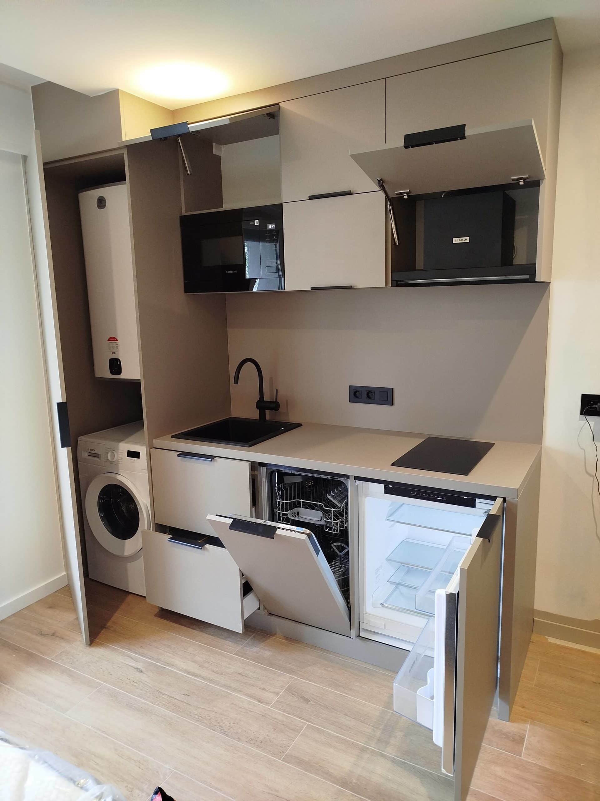 L’appartement étant de petite taille, l’agencement dont la cuisine a été conçu de manière efficace, compacte et fonctionnelle par l’architecte ALOONA DESIGN.